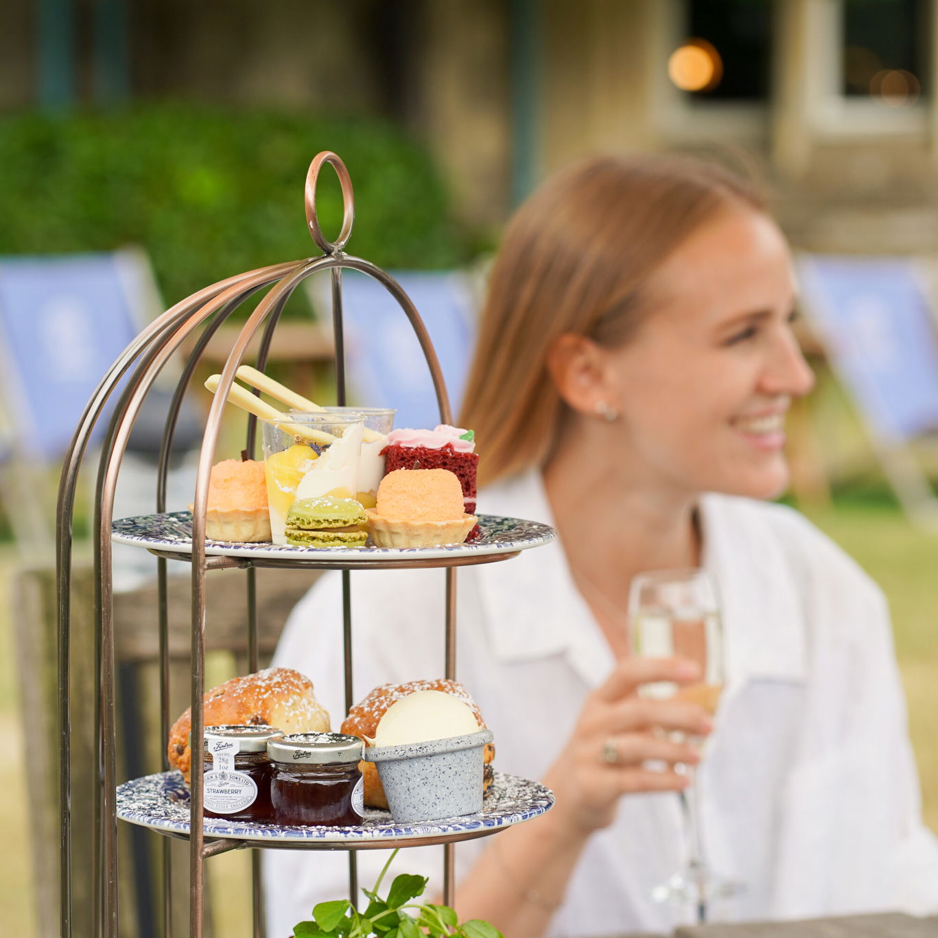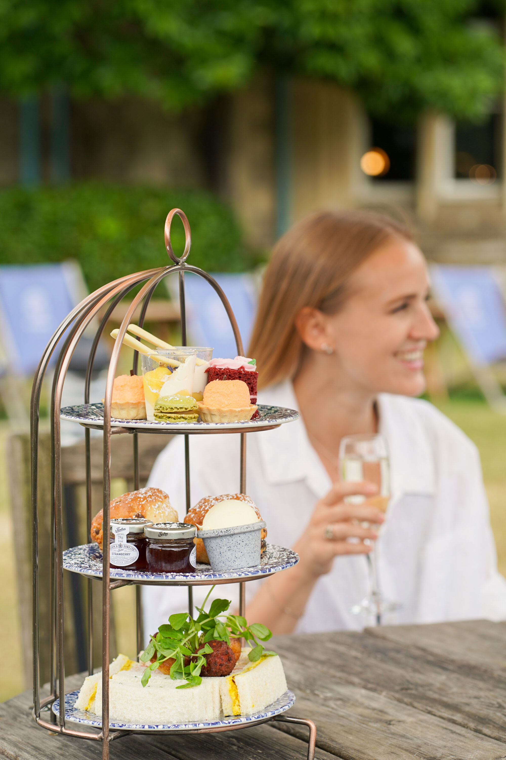 High tea on the Tortworth Court promenade complete with scones, tiny cakes, tea and champagne