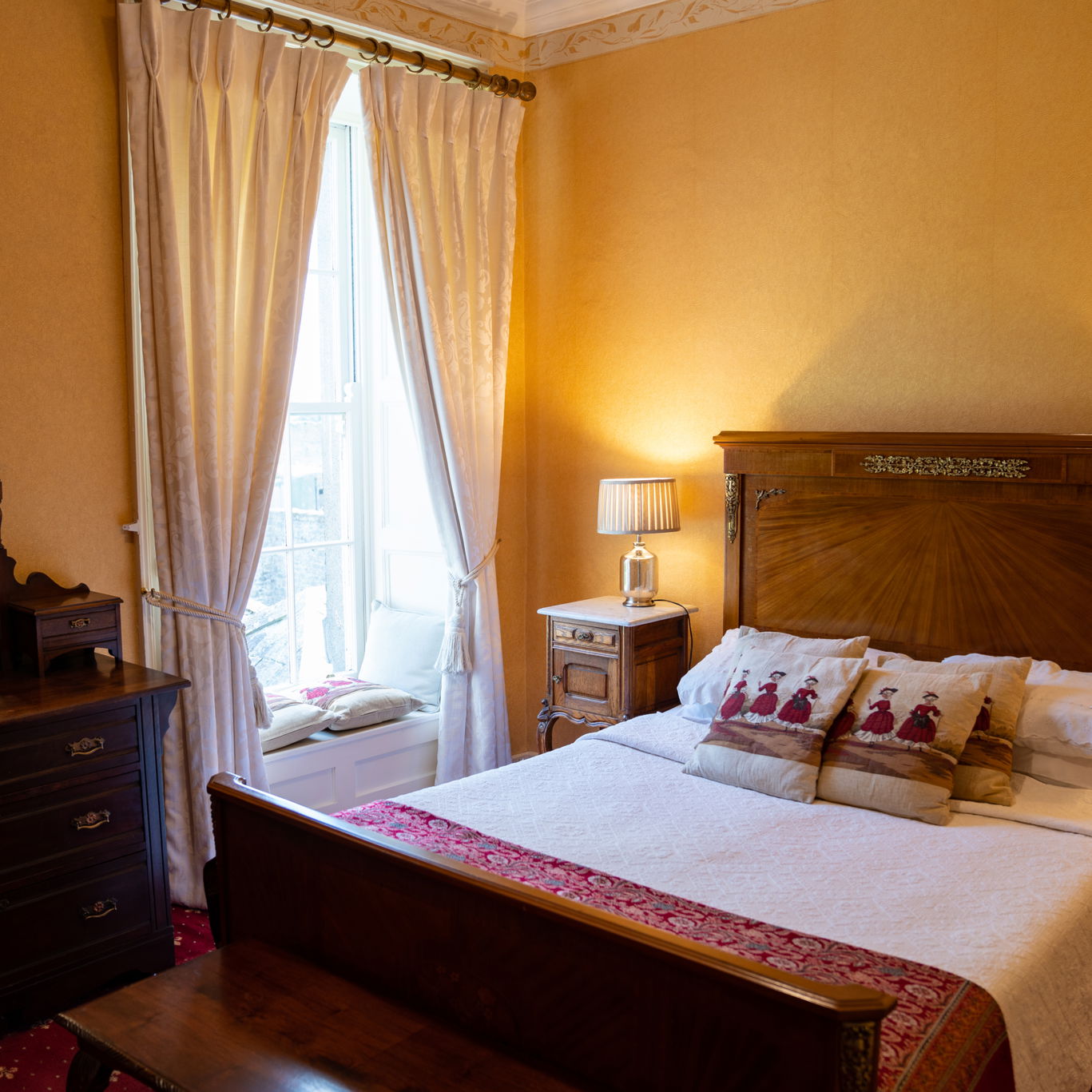 You’ll stay at the beautifully restored 300-year-old Inch House, a grand Georgian mansion offering six individually styled luxury ensuite rooms with antique furnishings and historic features, where room sizes and bathroom layouts vary in keeping with the character of the house.