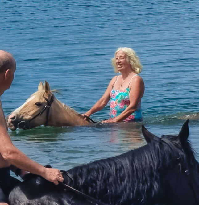 Reaching the bay, you and your horse will walk, trot and canter over the pink sand beach while absorbing the breathtaking, sprawling sand dunes. Weather permitting, Jane will time the ride so that the tides allow you to swim the horses bareback in the ocean, if you’d like! It’s a glorious afternoon of sandy, windswept trots and playing in the salty waves.