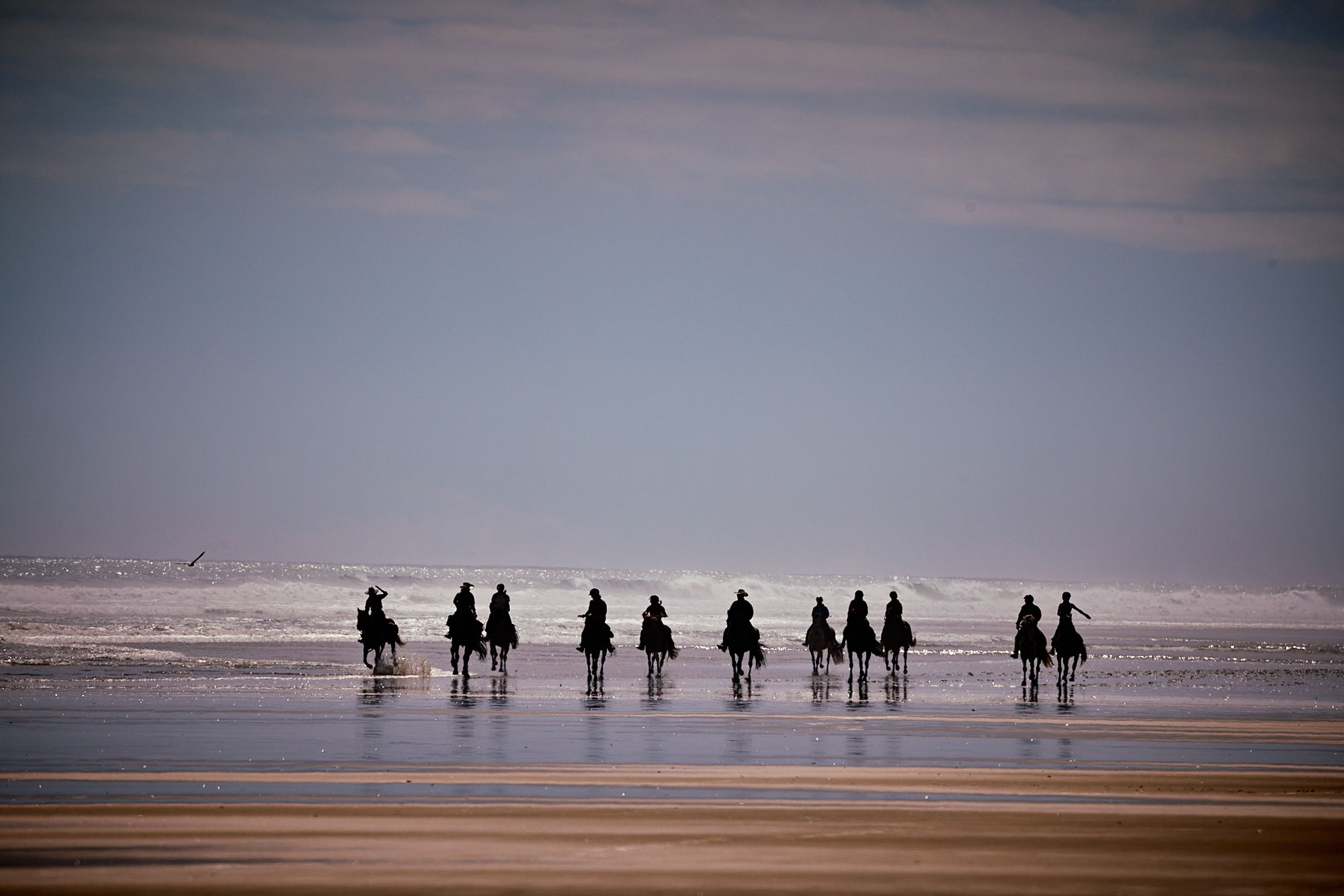 5 to 6 hours in the saddleTODAY is the day. The first of your wild horse rides is scheduled for this morning – after another filling breakfast, of course. Trucking the horses out to the west coast, you’ll ride through forestry, tussocks, sand dunes, and the wild 90 Mile Beach, where you’ll stalk herds of wild horses. Oh, and the BEST part: not a gate to be seen! With lunches packed in your saddle bags, you get to enjoy a full day in the saddle. You’ll dismount by a water hole for lunch, hopefully observing a mob of wild horses interacting with each other nearby.