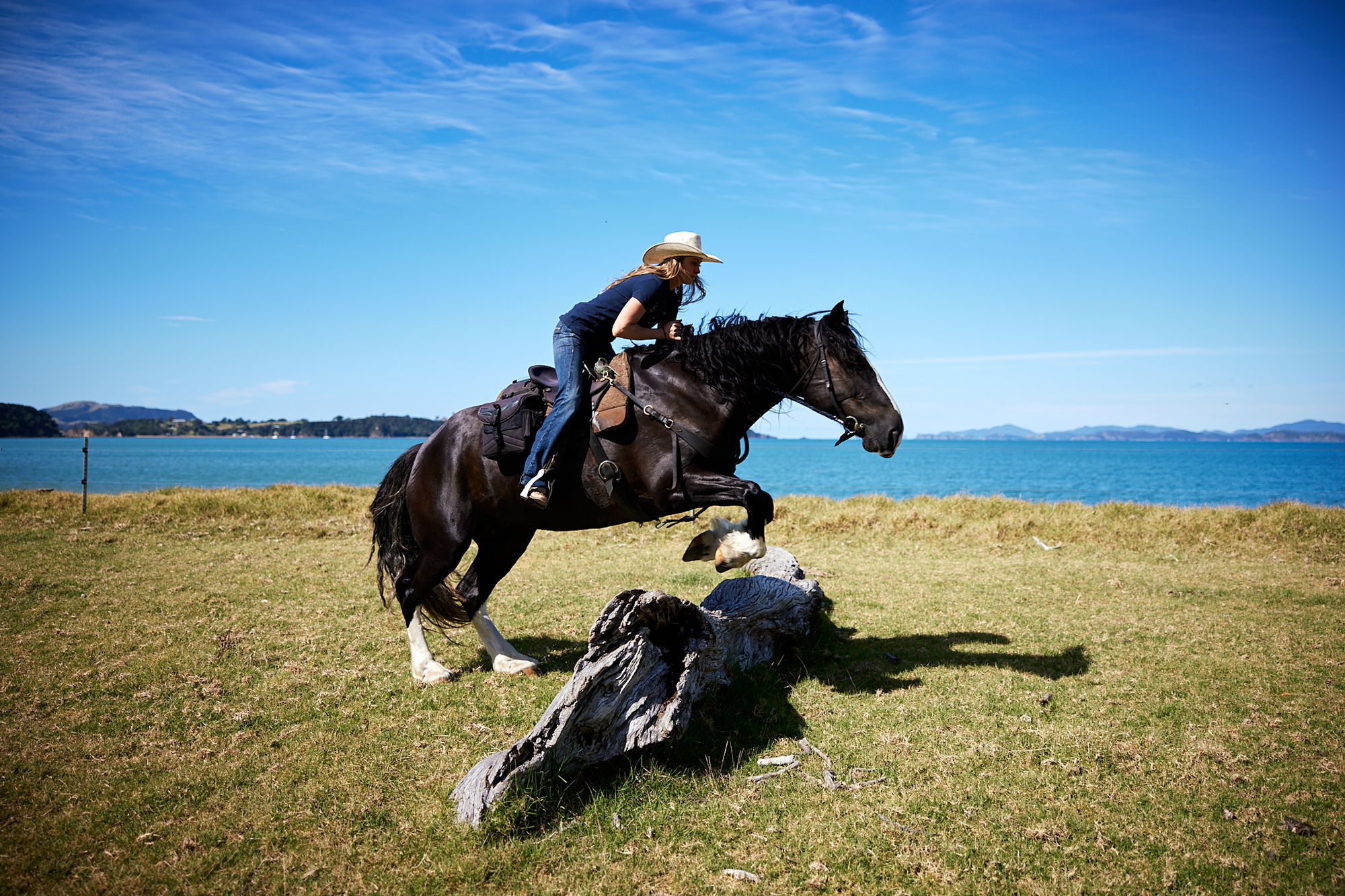 To help you get to know each other in a fun and stress-free environment, you’ll have a welcome session in the arena where you’ll do some groundwork, followed by some ridden obstacle challenges and a few games. Then Jane will take you on a ride over the farm, through spectacular native bush, along an historic road cut by British Soldiers in 1845 during the Maori Wars and finally to the awe-inspiring, massive, ancient Kauri trees (prepare to be impressed, globetrotters). Coming back to the farm, you’ll have a late lunch then pack up and head to Henderson Bay (approx 3hrs drive). You’ll be driving up the scenic east coast, where you’ll gasp at the stunning scenery of Doubtless Bay. There’s a mandatory pit-stop (it’s tradition) at the ice cream shop (included in the ride price), which sits near the beautiful pink sands of Cable Bay. Finally, you’ll reach the beach cabins at Jane’s spectacular Henderson Bay property, which you’ll call home for the remainder of your trip.