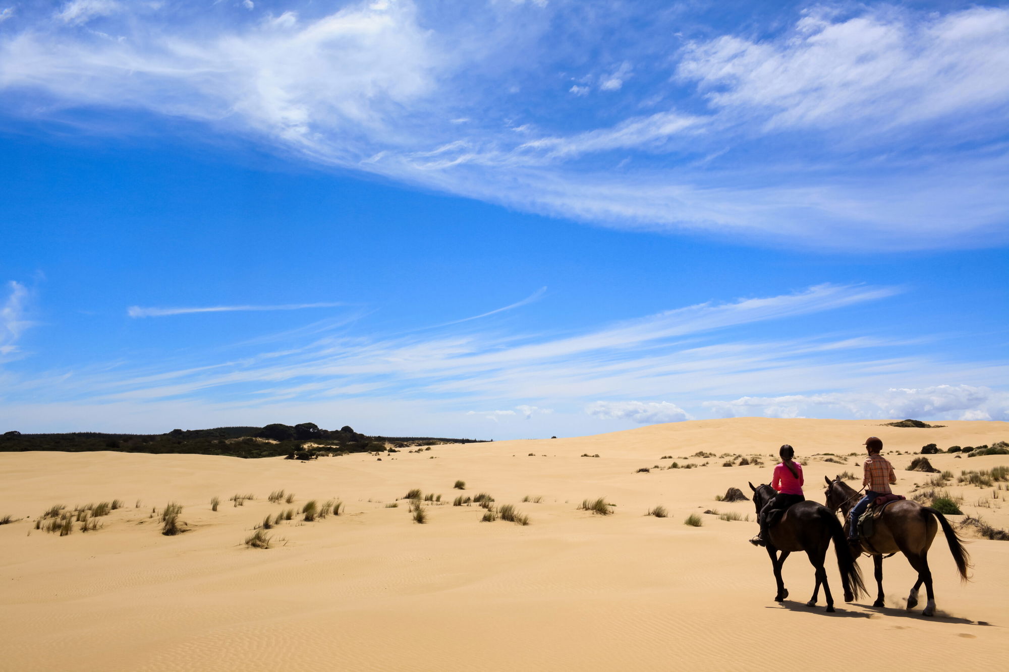 Later in the day, you’ll mount up and head out from Jane’s property onto Henderson Bay. Along the way, Jane will point out the remnants of the 32-metre-high tsunami that made landfall in the 1400s. Reaching the bay, you and your forward-moving horse will walk, trot and canter over the pink sand beach while absorbing the breathtaking, sprawling sand dunes. Jane will time the ride so that the tides allow you to swim the horses bareback in the ocean, if you’d like! It’s a glorious ride of windswept canters and playing in the salty waves. If the tides work in your favour (fingers crossed), you’ll get to enjoy a moonlight ride.