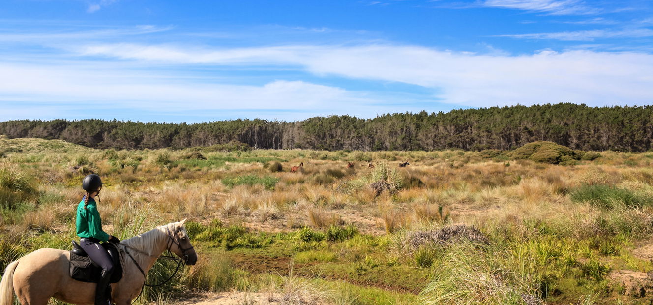 3 to 4 hours in the saddleToday brings the first of your wild horse rides! After trucking the horses to the west coast, you’ll mount up at about 11am to ride through forestry, tussocks, sand dunes, and the wild 90 Mile Beach, where you’ll stalk herds of wild horses. You’ll dismount at a waterhole for a saddlebag-packed lunch, hopefully observing wild horses interacting with each other nearby.