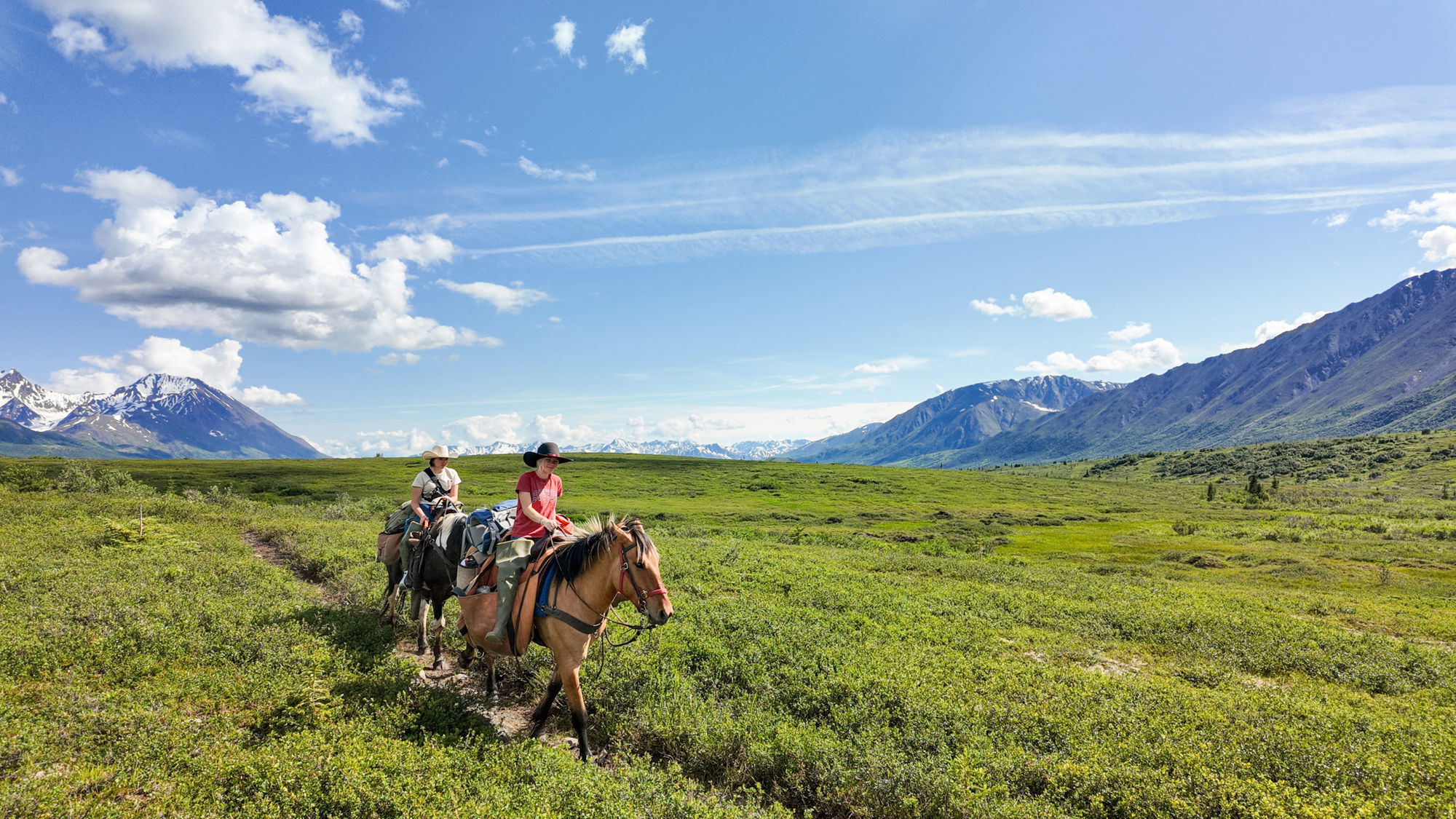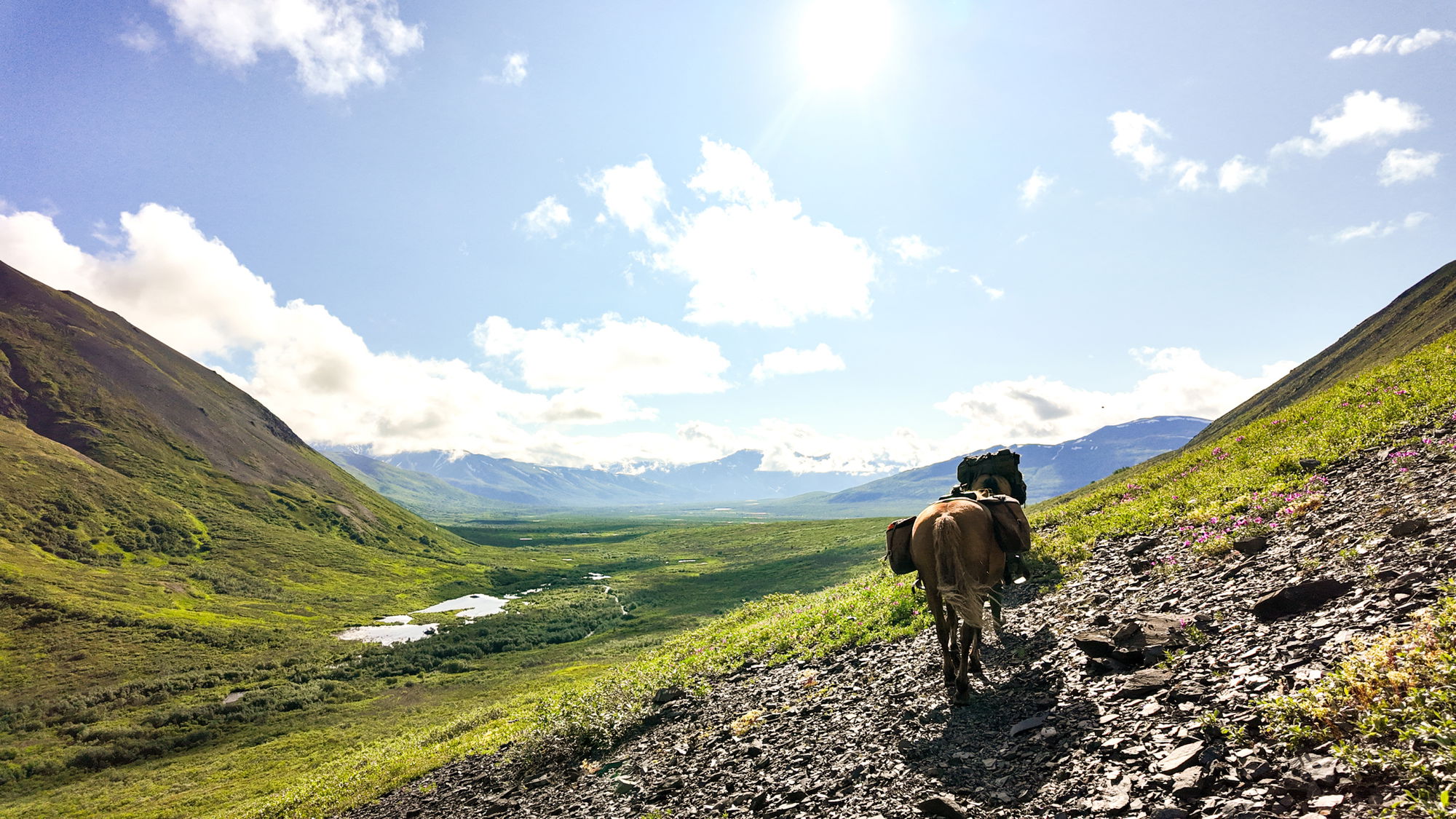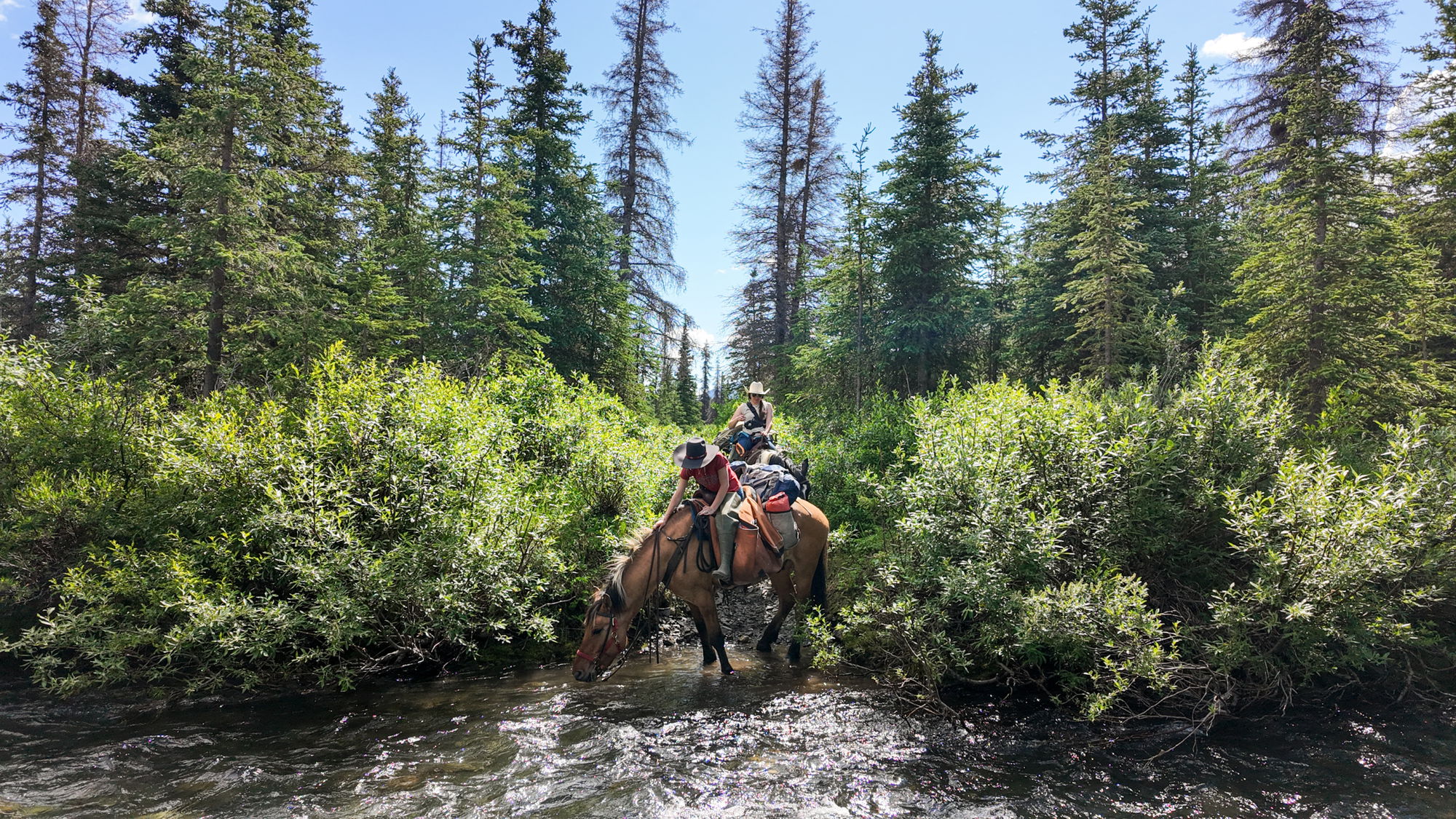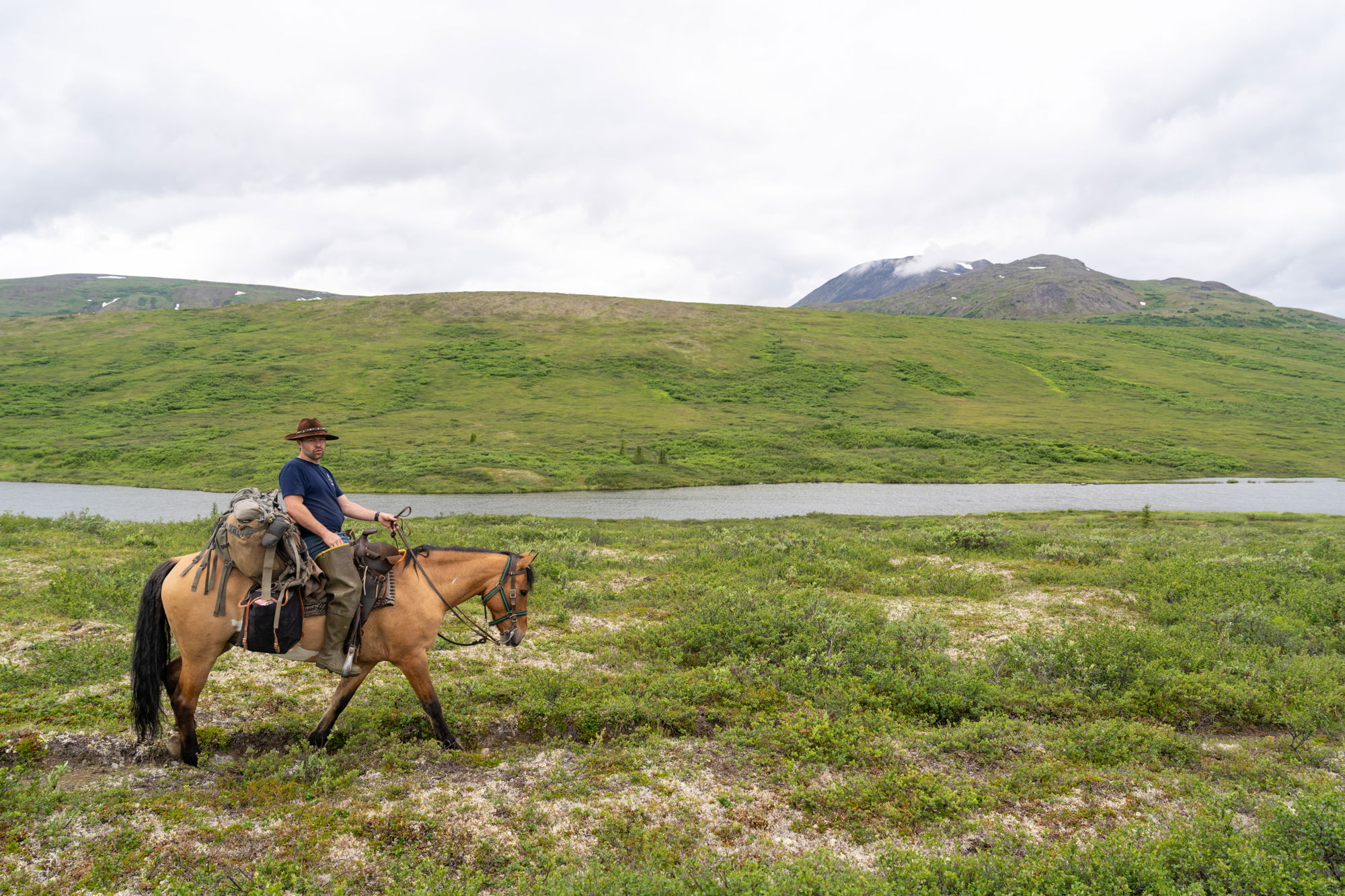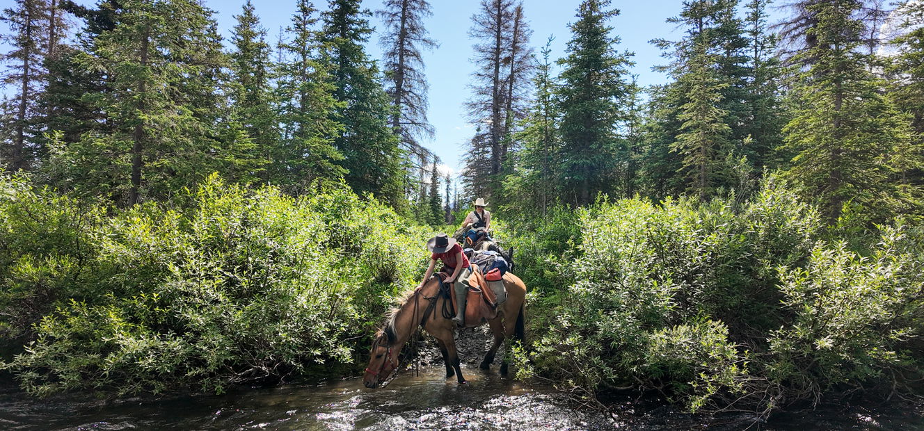3 to 4 hours in the saddleAfter breakfast at 9am (no alarms dictate the pace here!), you’ll get packed for the 5-night journey ahead. This first pack takes some time, as the team ensure the horses are loaded up evenly and fairly and that everything is 100% prepared. Still, when the sun doesn’t set, there’s no need to hurry! After lunch at the lodge, it’s an easy 3 to 4 hour ride up the Ptarmigan Valley to the cabin at Halfway Lake, with some off-trail excursions if the opportunity arises.