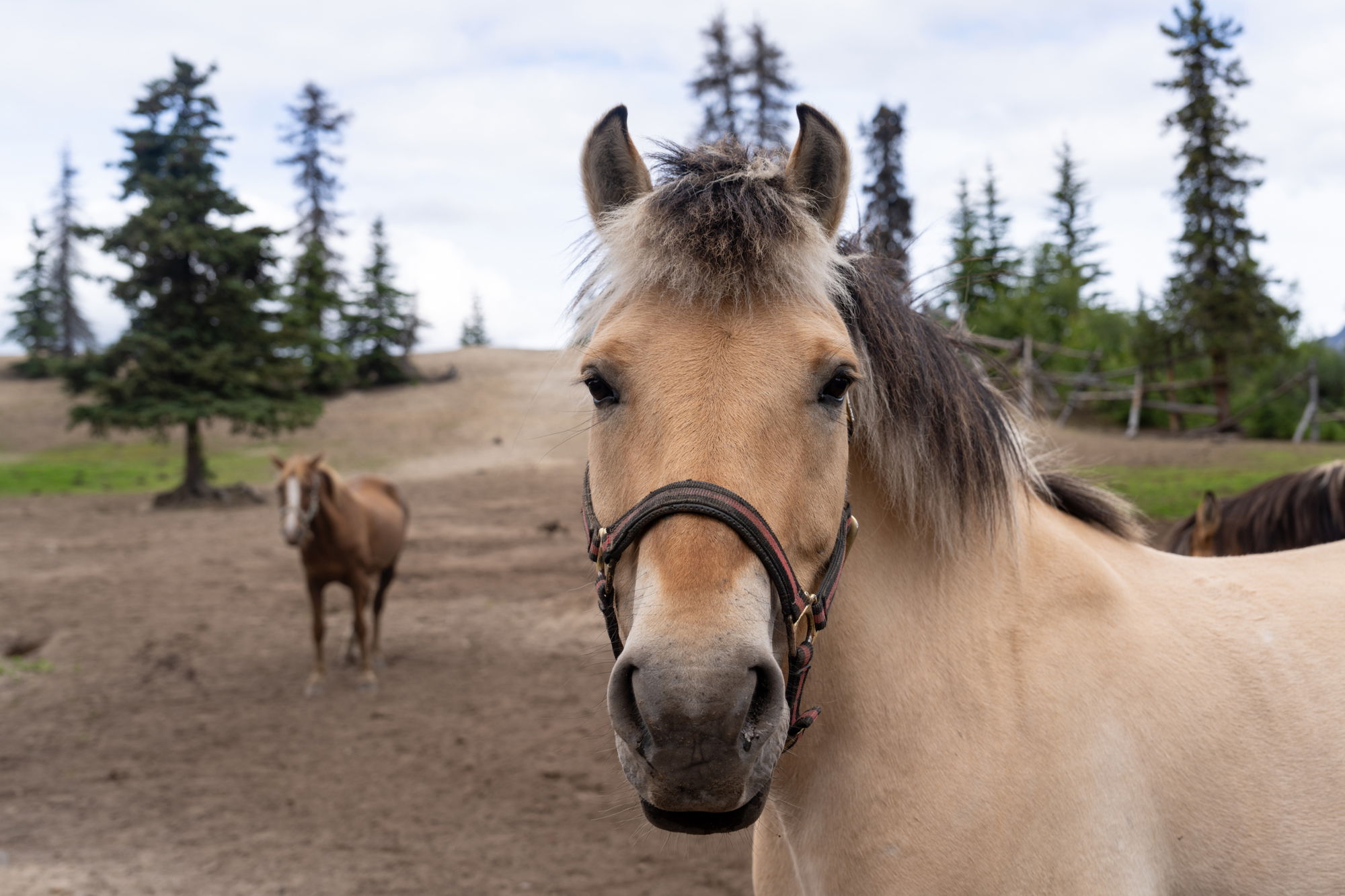 A mix of Norwegian Fjord, Fjord-Percheron cross, Quarter Horse-cross, and Morgan horses, all incredibly strong and hardy. The horses roam free in the mountains year-round, so they do collect some superficial bumps and scratches, but they are very much loved and cared for.