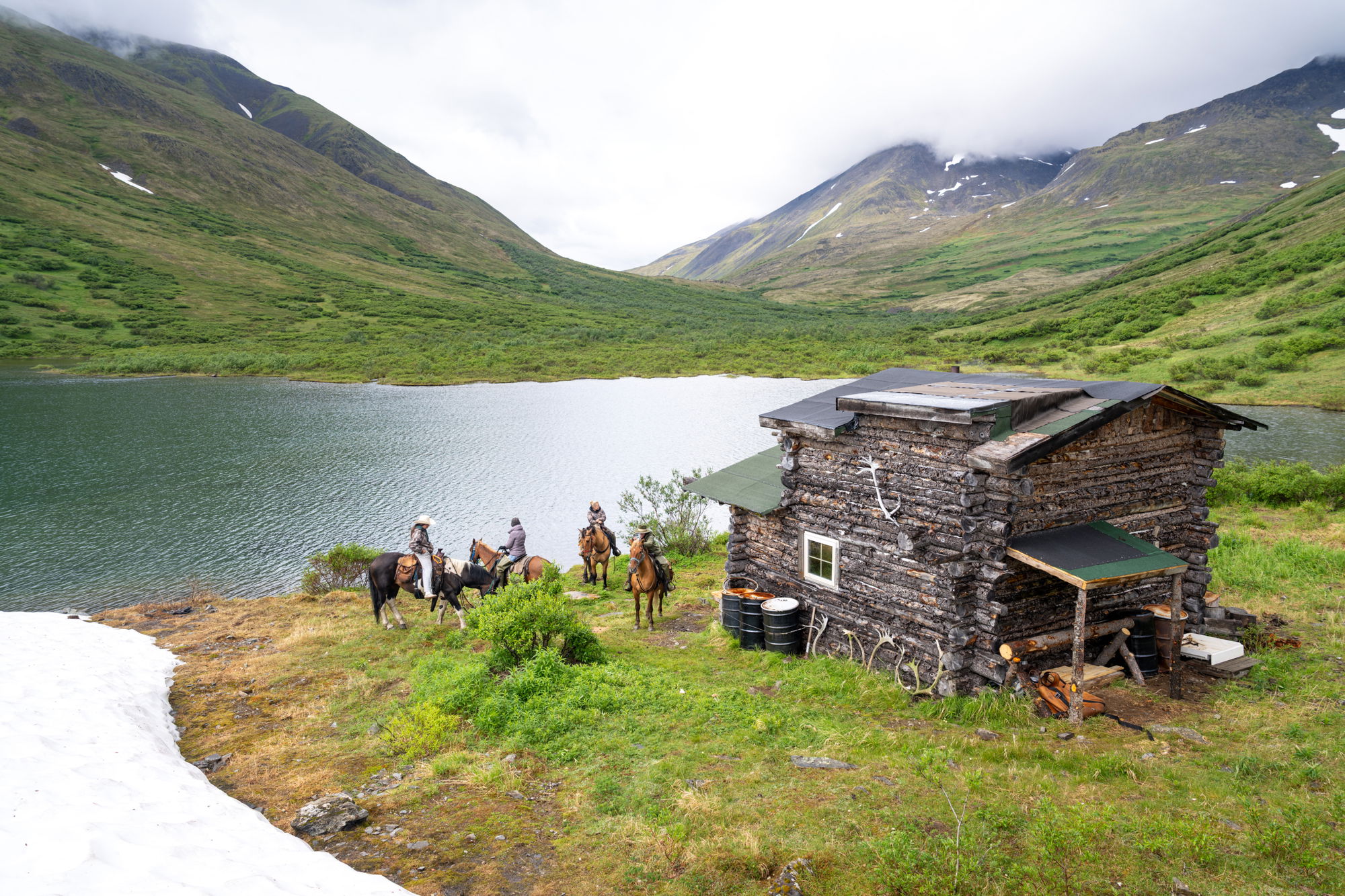 At the top of Rainy Pass, you’ll take some happy snaps framed by the stark, wild peaks of the Alaska Range, and explore on foot or on horseback before heading down to Rainy Pass Lake, where tonight’s cabin awaits.