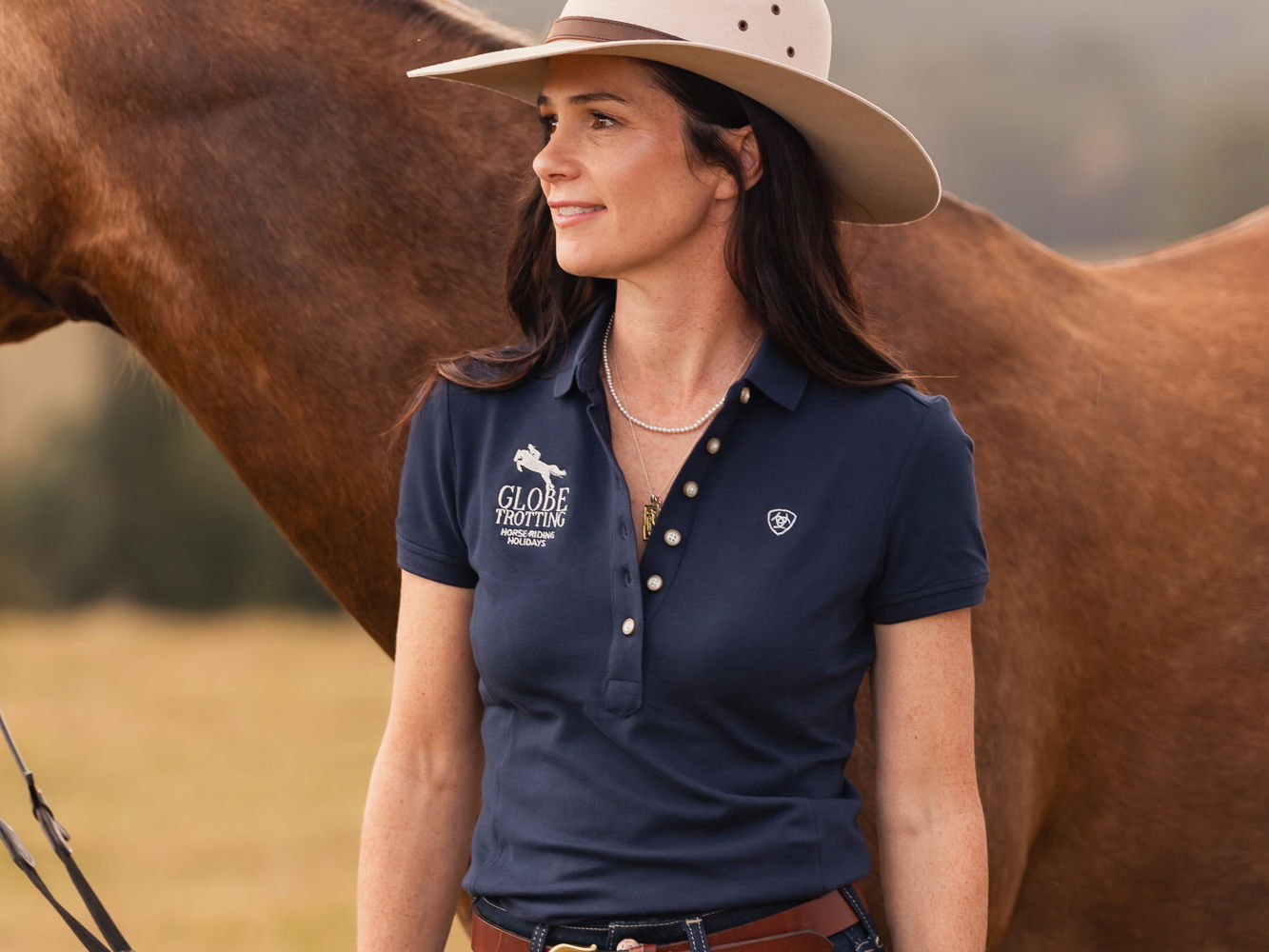 View sizing chartThis polo is a best friend for all shapes. It lays beautifully over breeches for a flattering fit and smoother coverage. Feminine details include delicate buttons on an elongated button placket. Crafted from Better Cotton Initiative (BCI) cotton. BCI is a non-profit that promotes better standards in cotton farming.